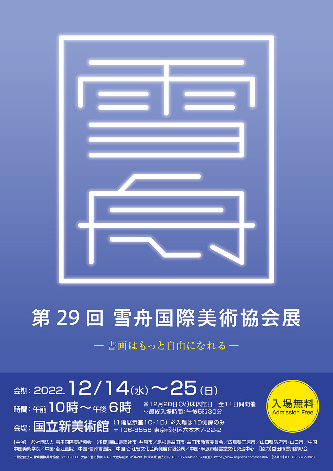 | 後 援 | 岡山県総社市・井原市/島根県益田市・益田市教育委員会/広島県三原市/山口県防府市・山口市/中国・中国美術学院/中国・浙江画院/中国・曹州書画院/中国・浙江省文化芸術発展有限公司/中国・寧波市藝雲堂文化交流中心 |