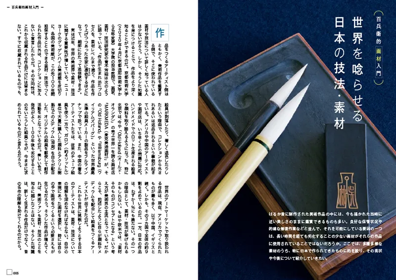 本号では、画材メーカーと様々な画材を使って世界を舞台に活躍する谷原菜摘子などの若手アーティストを紹介します。中国や朝鮮半島由来の紙や墨、筆。幕末期に西洋から伝来した油絵具。日本人はこれらに代表される画材を、より良いものへと進化させ、長い時間にわたり育んできました。しかし、時代が進むにつれて求められるものも変化し、材料不足から従来の画材は製造困難になっています。そんな中で、日本の画材メーカーの多くは環境の変化に順応し、国内はもとより世界でも通用する製品を作りつづけています。